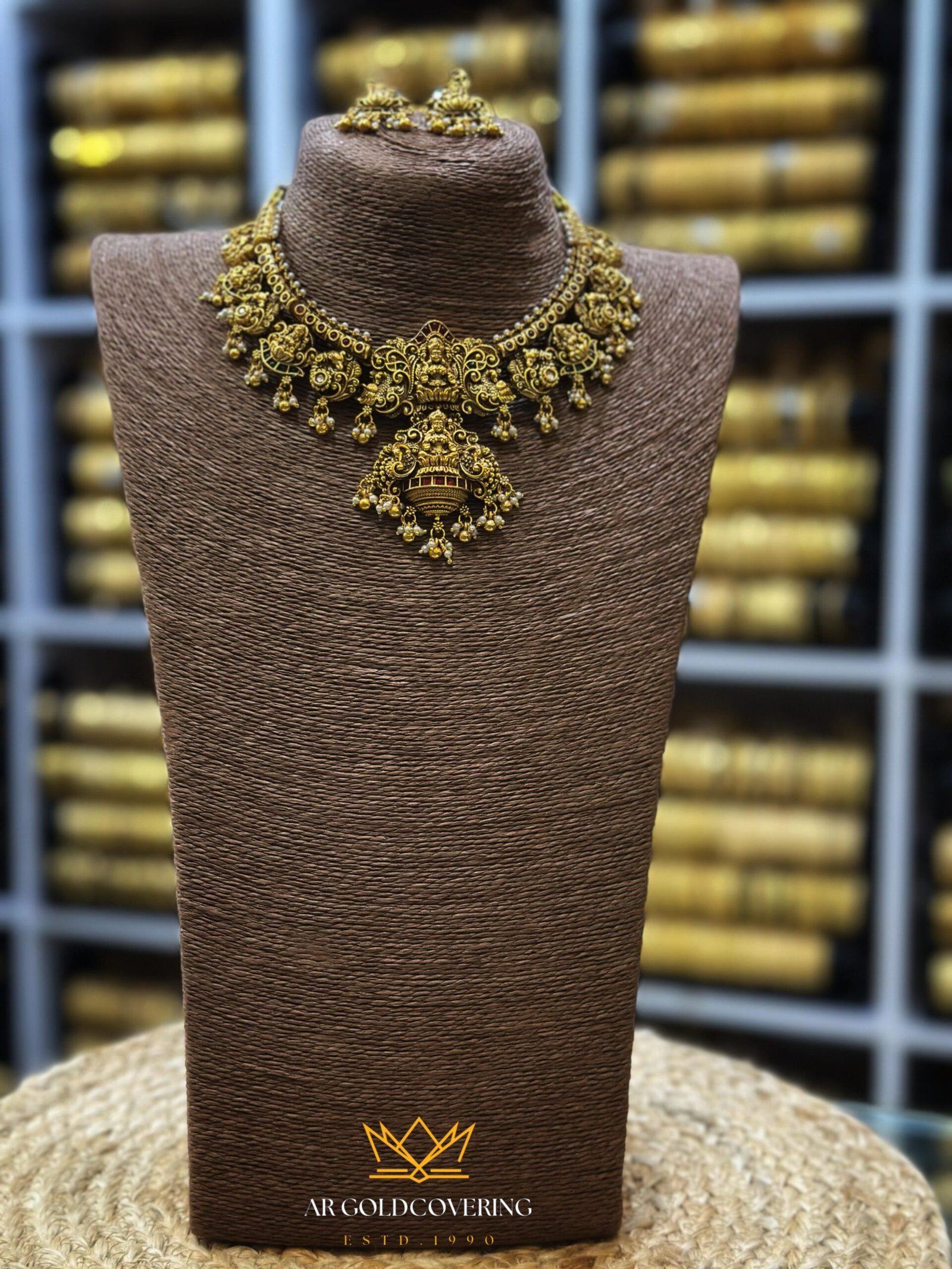 A majestic Haram set featuring intricate gold-plated detailing in an antique finish. The centerpiece is a beautifully sculpted Goddess Lakshmi, symbolizing prosperity and grace. The set includes a, layered chain (haram) and matching earrings, both designed with traditional motifs and fine craftsmanship. Perfect for weddings, temple ceremonies, or festive occasions where you want to make a strong cultural statement.