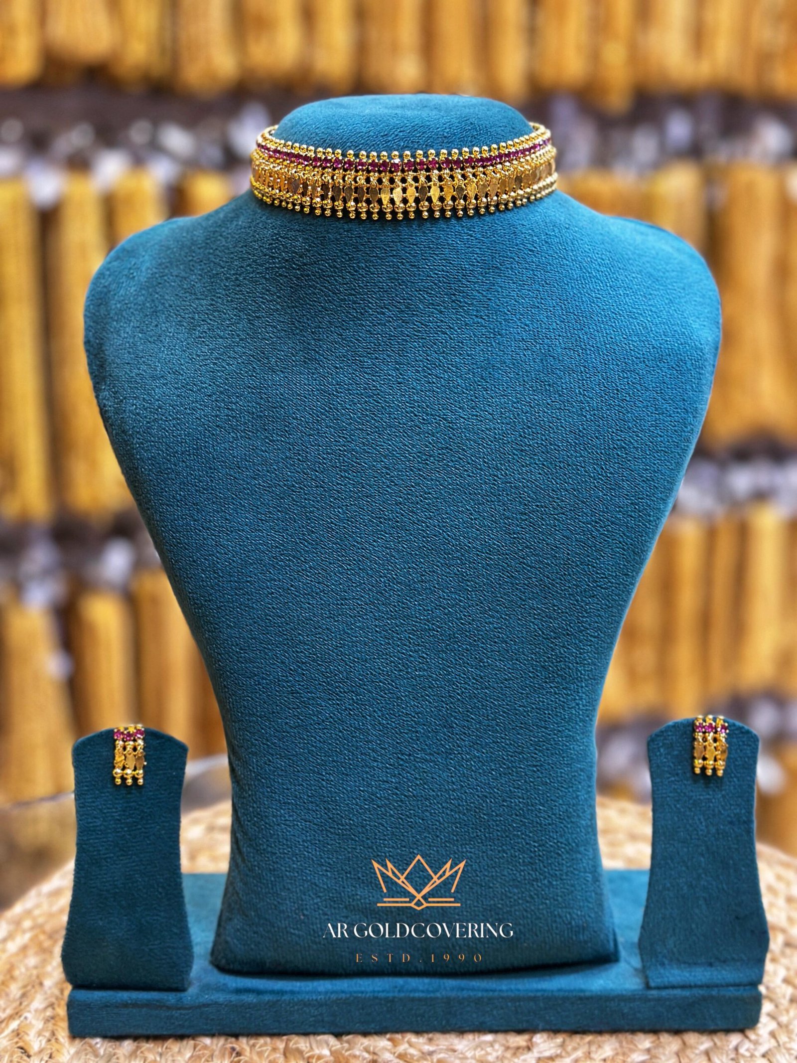 This elegant set features a single-strand elakkathali (cable chain) plated in rich gold, adorned with vibrant ruby-coloured stones, and comes with matching earrings. A refined piece that exudes sophistication — ideal for festivals, traditional celebrations, or special occasions.
