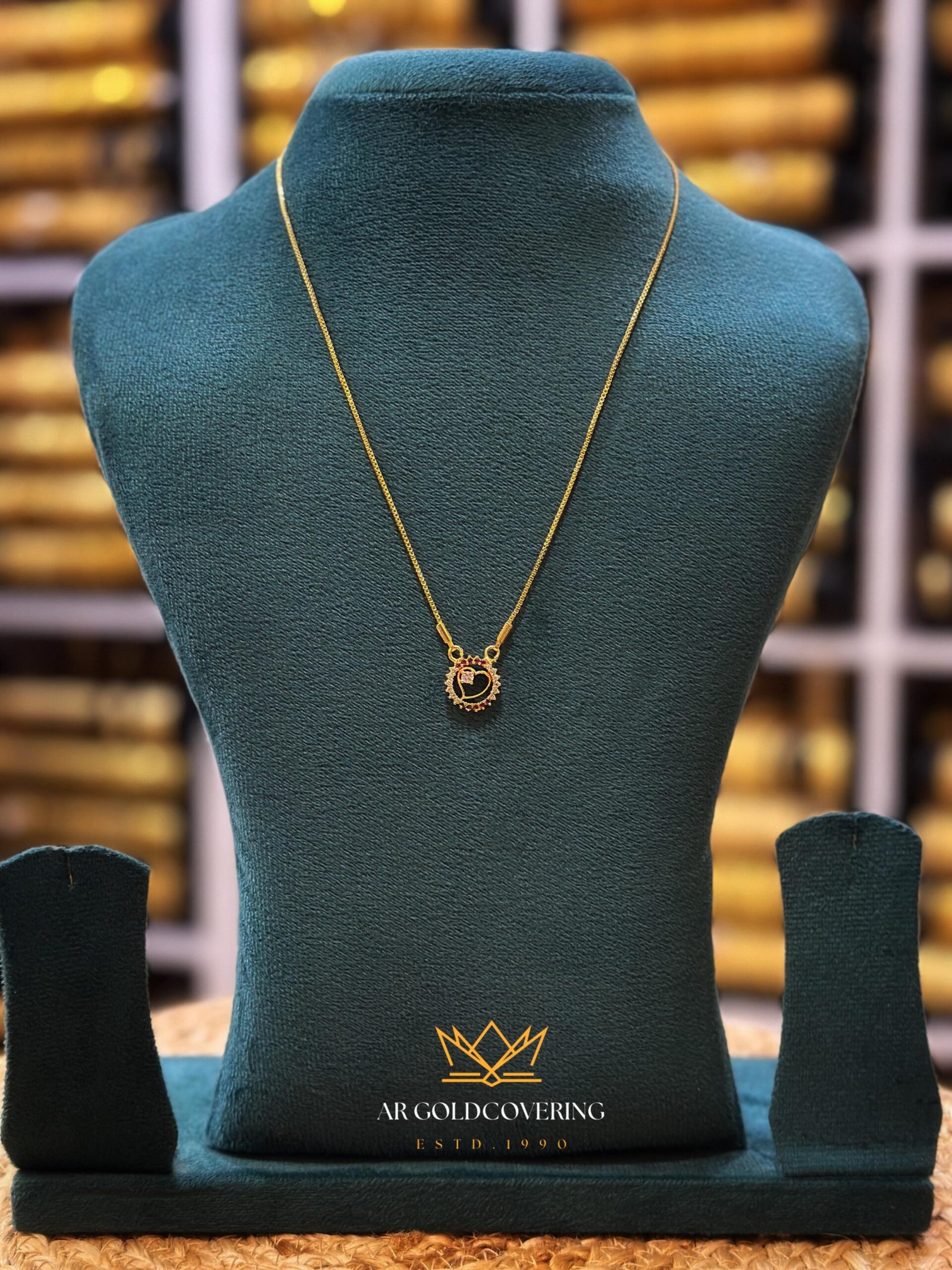 A delicate 18-inch box chain in rich gold plating, adorned with a petite pendant studded with sparkling AD-stones. Elegant and refined, this piece brings a touch of glamour and sophistication — ideal for pairing with traditional outfits or modest evening wear.