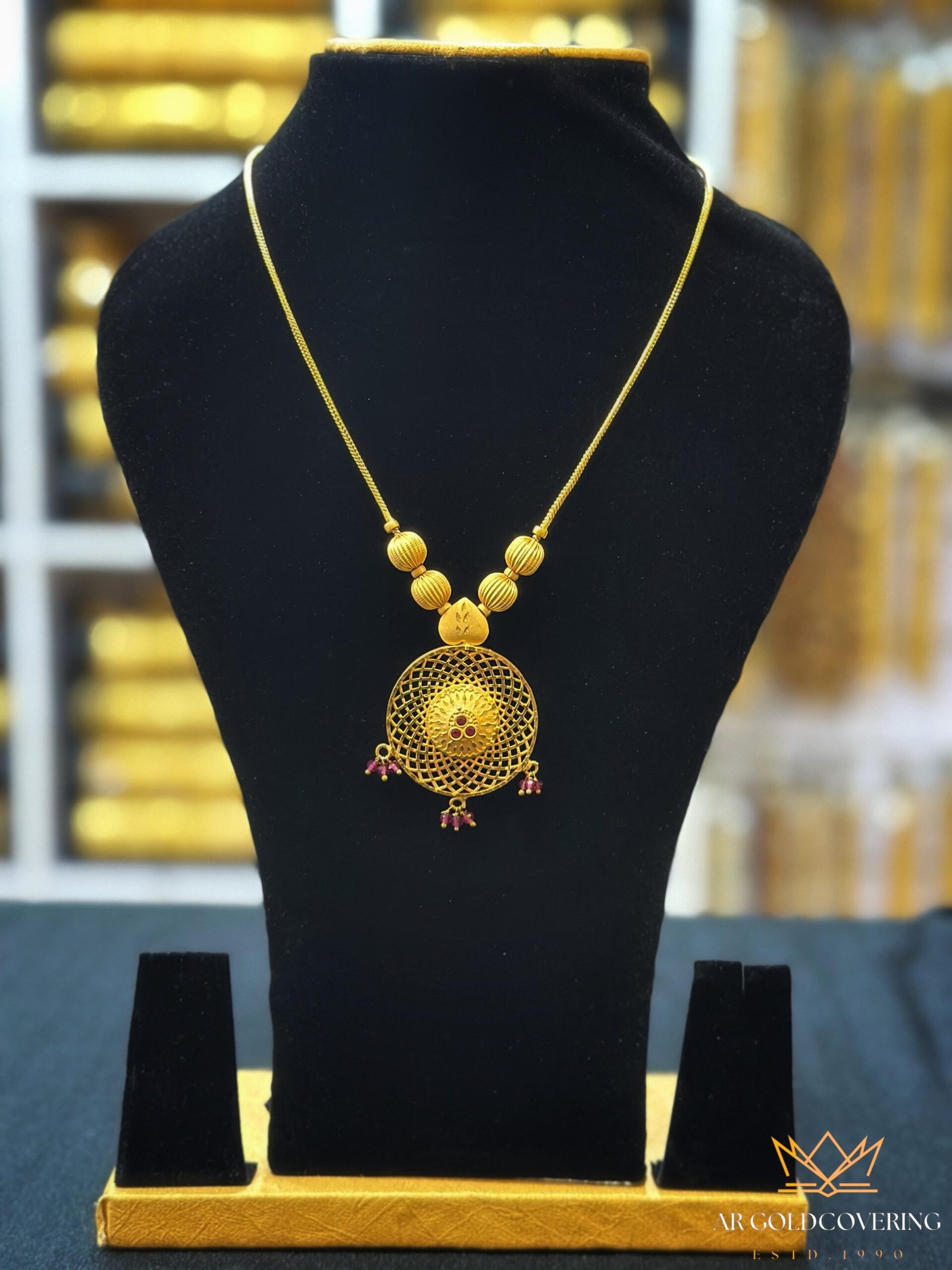 Gold plated 18inches simple necklace with Ruby stones and crystal beads(0008)