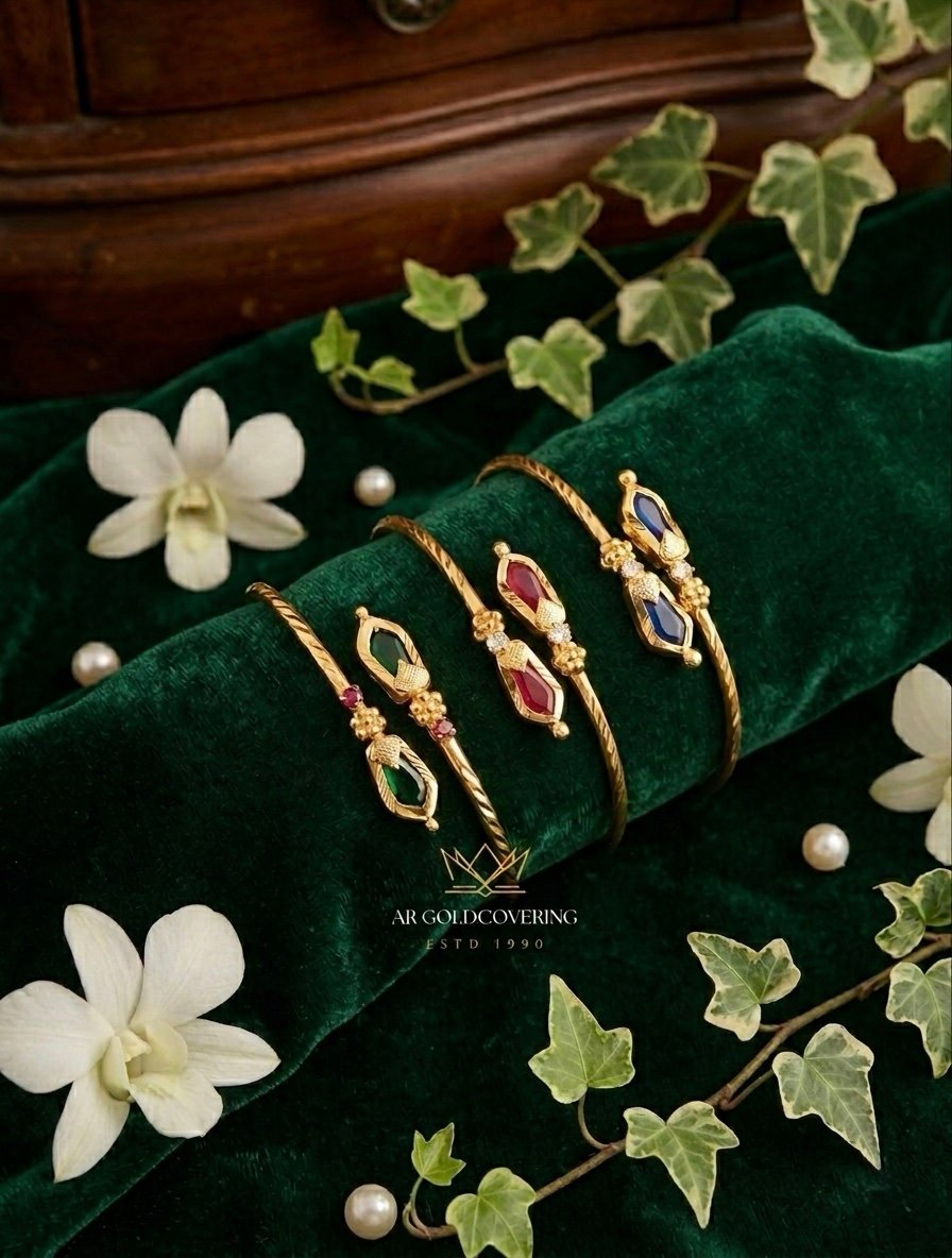 Embrace the timeless elegance of Kerala’s heritage with our exquisite Gold Plated Nagapadam Bangle. Featuring the iconic serpent-hood motif adorned with vibrant, classic stones, this piece seamlessly blends traditional craftsmanship with modern versatility. The open, adjustable design ensures a perfect, comfortable fit for any wrist, making it an effortless addition to your jewelry collection.