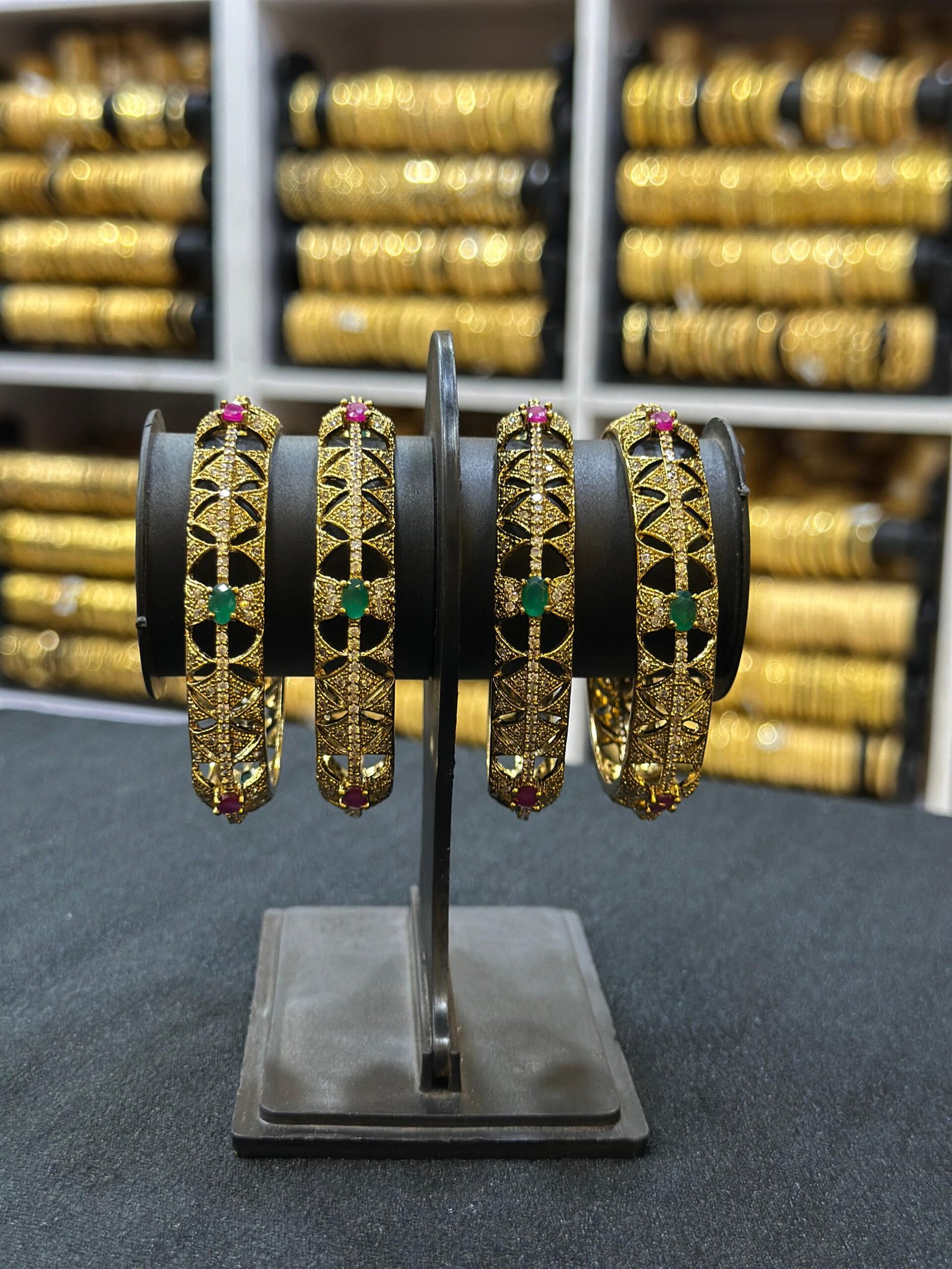 Add a touch of timeless elegance to your look with these beautifully crafted gold plated bangles. Designed with an exquisite antique finish, each bangle features sparkling AD stones along with rich ruby-tone and emerald-tone accents that enhance its traditional charm. The intricate cutwork pattern gives it a premium handcrafted appeal, making it perfect for festive wear, weddings, and special occasions.