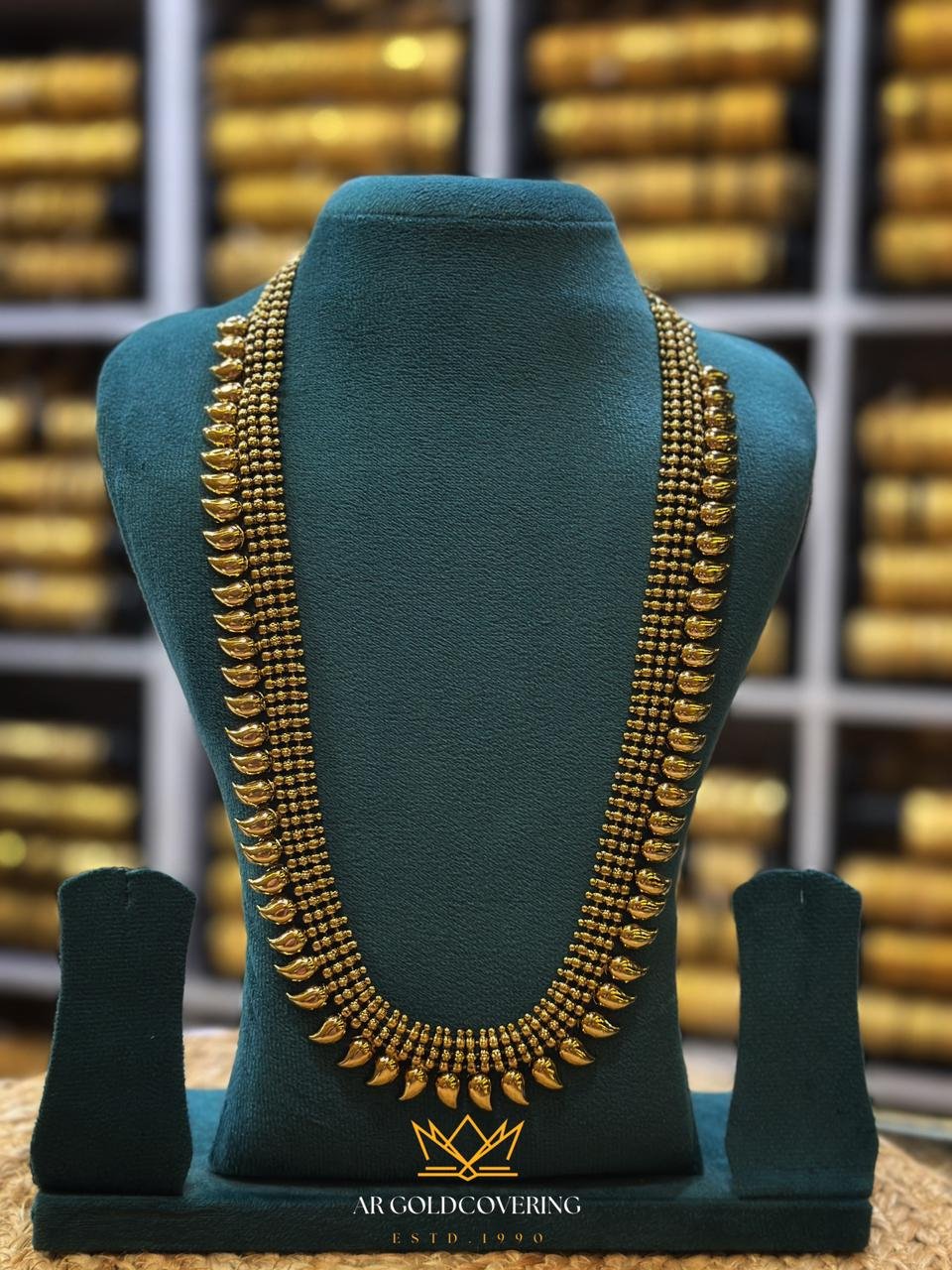 This long haram is best showcased when paired with a Kanchipuram Silk or Kasavu Saree. For a complete traditional look, layer it with a shorter necklace like a Palakka or a simple Elakkathali choker. The antique finish makes it particularly stunning against deep jewel tones like maroon, mustard, or emerald green.