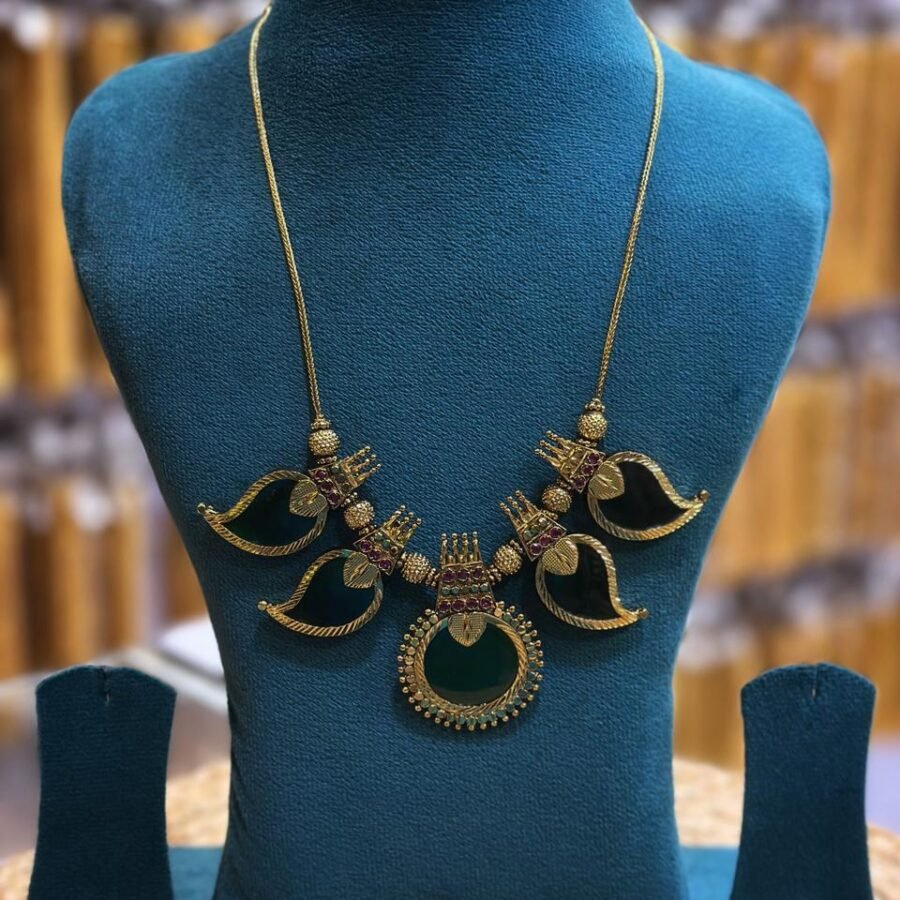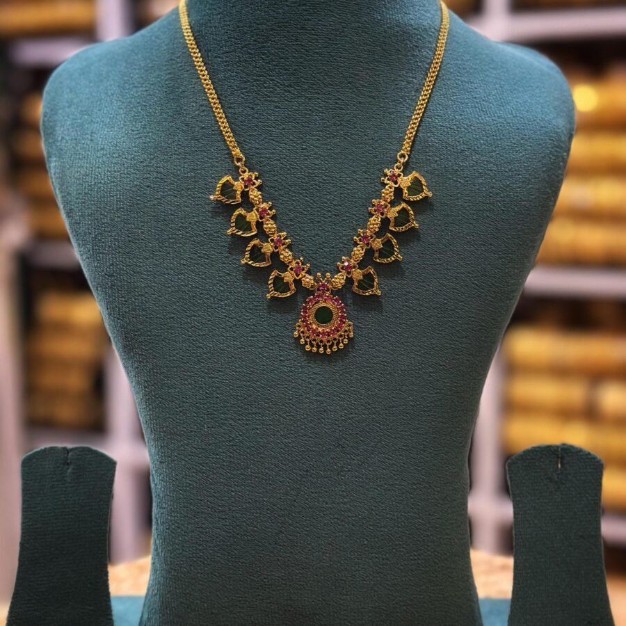 Embrace the timeless beauty of traditional South Indian jewelry with this exquisite Palakka Necklace. This piece combines the revered antique finish with authentic Palakka stones, creating a rich, heirloom-quality look.