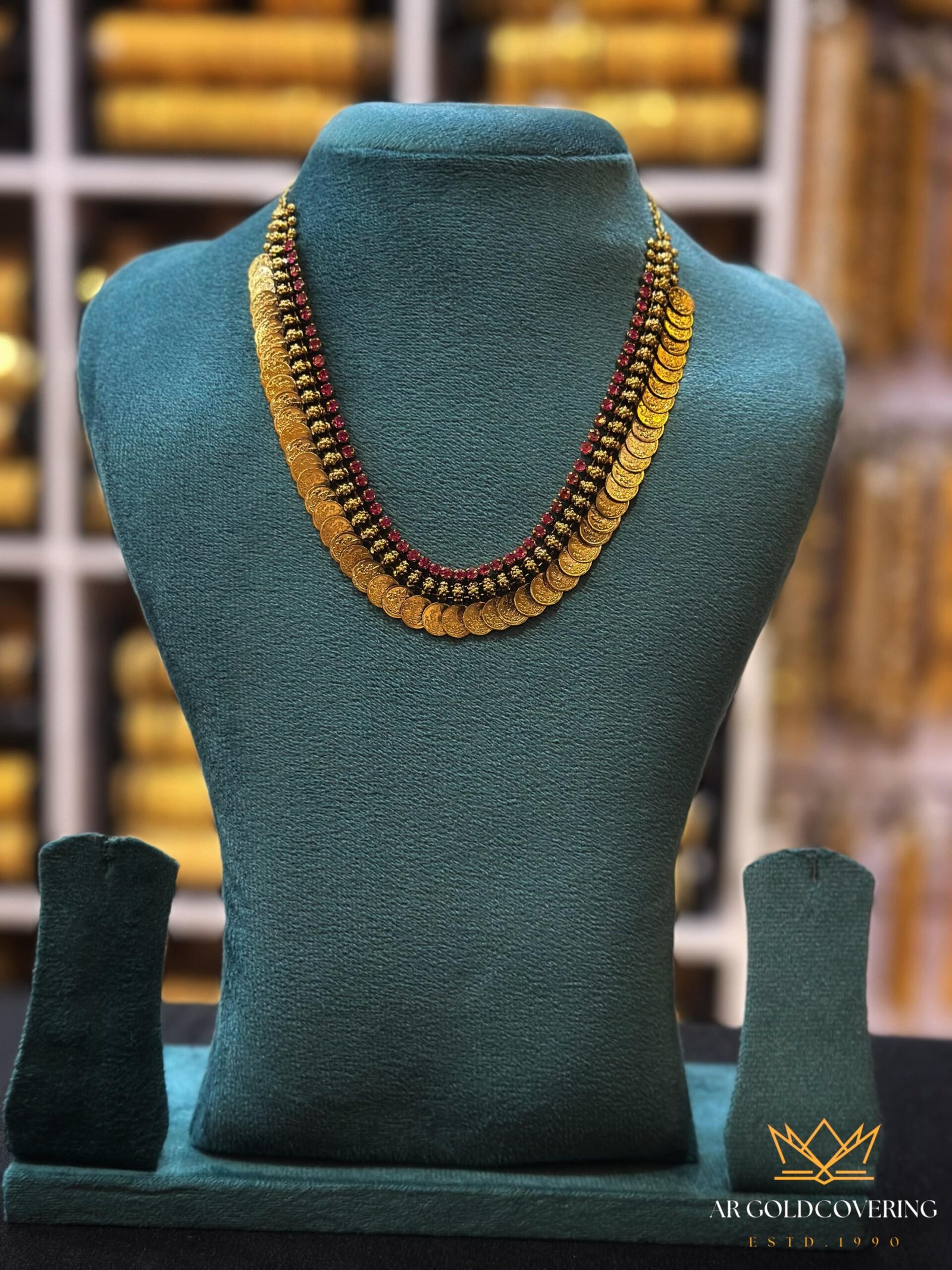 Gold plated Antique look short Lekshmi kassu haram with Ruby stones(0050)