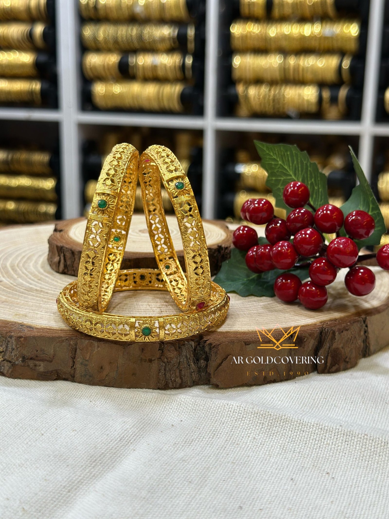 • Stone Work: Densely embellished with traditional Kemp Stones in striking colors ( deep ruby and emerald ), set directly into the bangle’s intricately textured surface pattern.