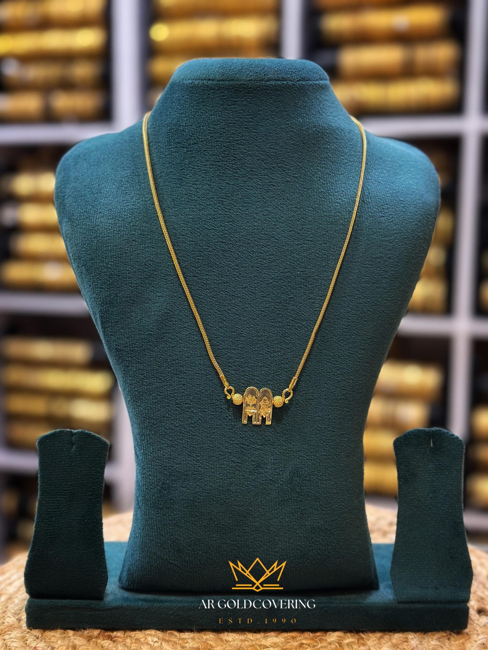 The Bhramana Thali (Brahmin Thali) is a sacred and culturally significant pendant, traditionally featuring two distinct vertical tablets joined at the top. This gold-plated version captures the intricate details of this heirloom design, paired with a classic long chain for a graceful look.