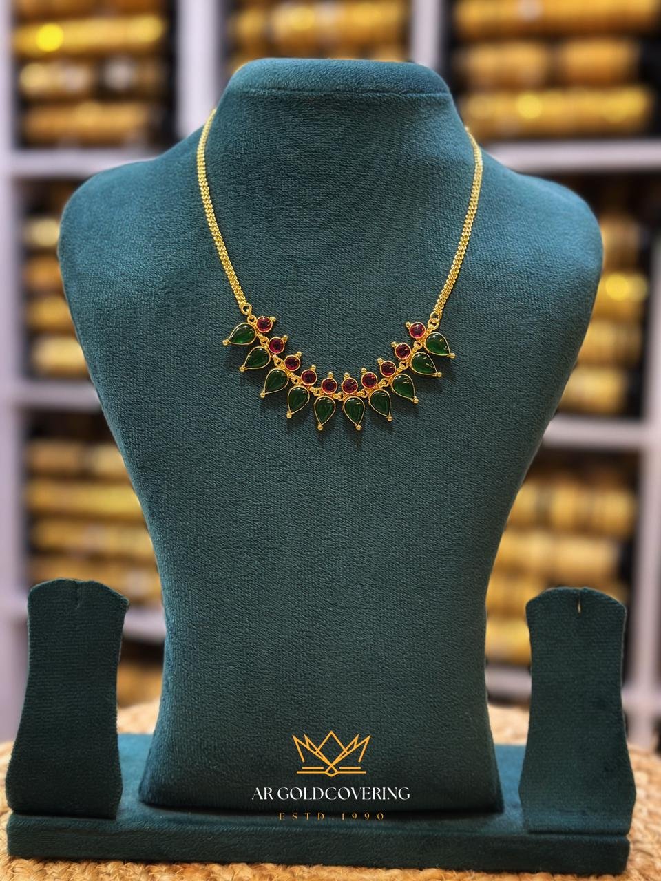 Reimagine classic elegance with our signature Gobi Palakka Necklace. Featuring the traditional leaf-shaped green stones and brilliant ruby-red accents, this piece is finished in a natural gold luster that captures the authentic shine of pure 22KT gold.