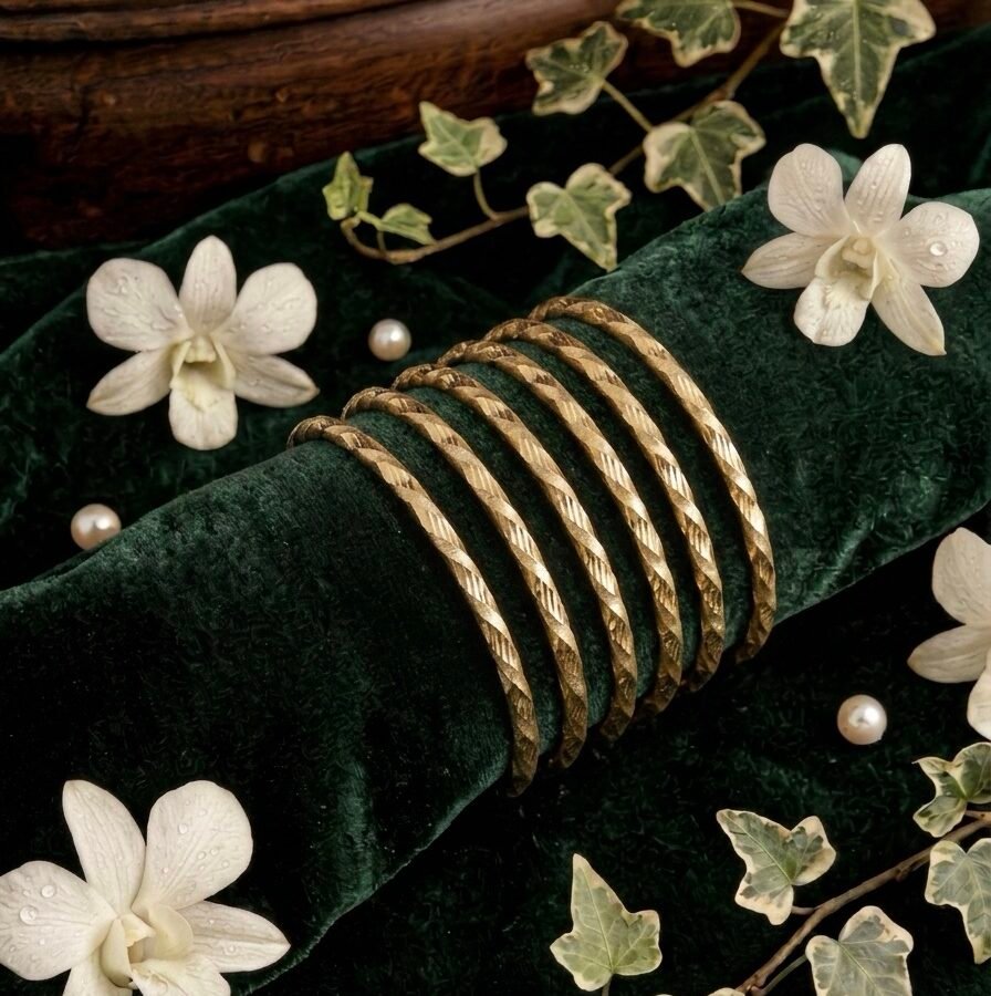These medium-width bangles are made for women who love fine details. They feature repeating geometric and beaded patterns that catch the light beautifully.
