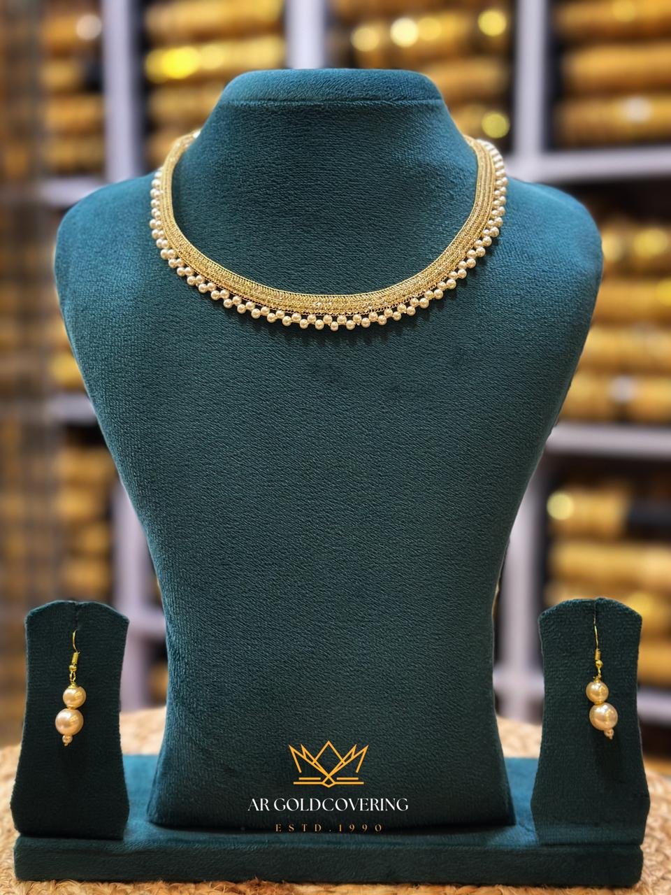 This elegant set features a gold-plated necklace strung with lustrous pearls, paired with matching pearl earrings. The design balances classic grace and Kerala-inspired traditional charm, making it ideal for weddings, cultural celebrations, or festive occasions.