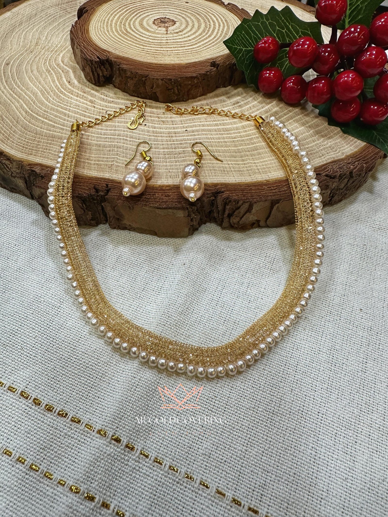 - Necklace (Choker Style): The main body of the necklace is a wide, gold-plated mesh design, offering a unique texture and comfortable fit around the neck. The lower edge is elegantly bordered by a continuous row of small, round white pearls. The necklace includes an adjustable chain and clasp for flexible sizing.