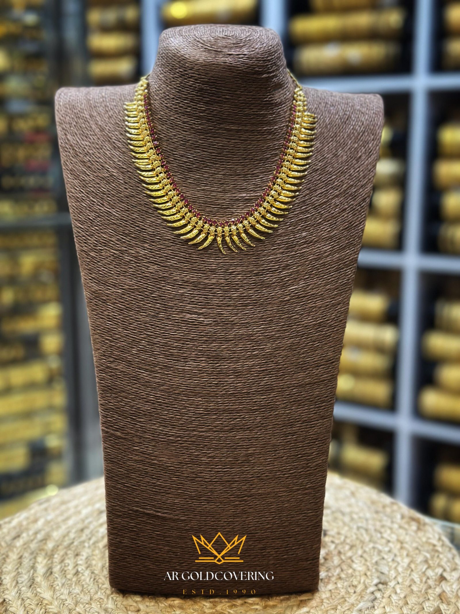 It is richly adorned with vibrant Ruby stones, giving it a luxurious and authentic look that shines brilliantly.