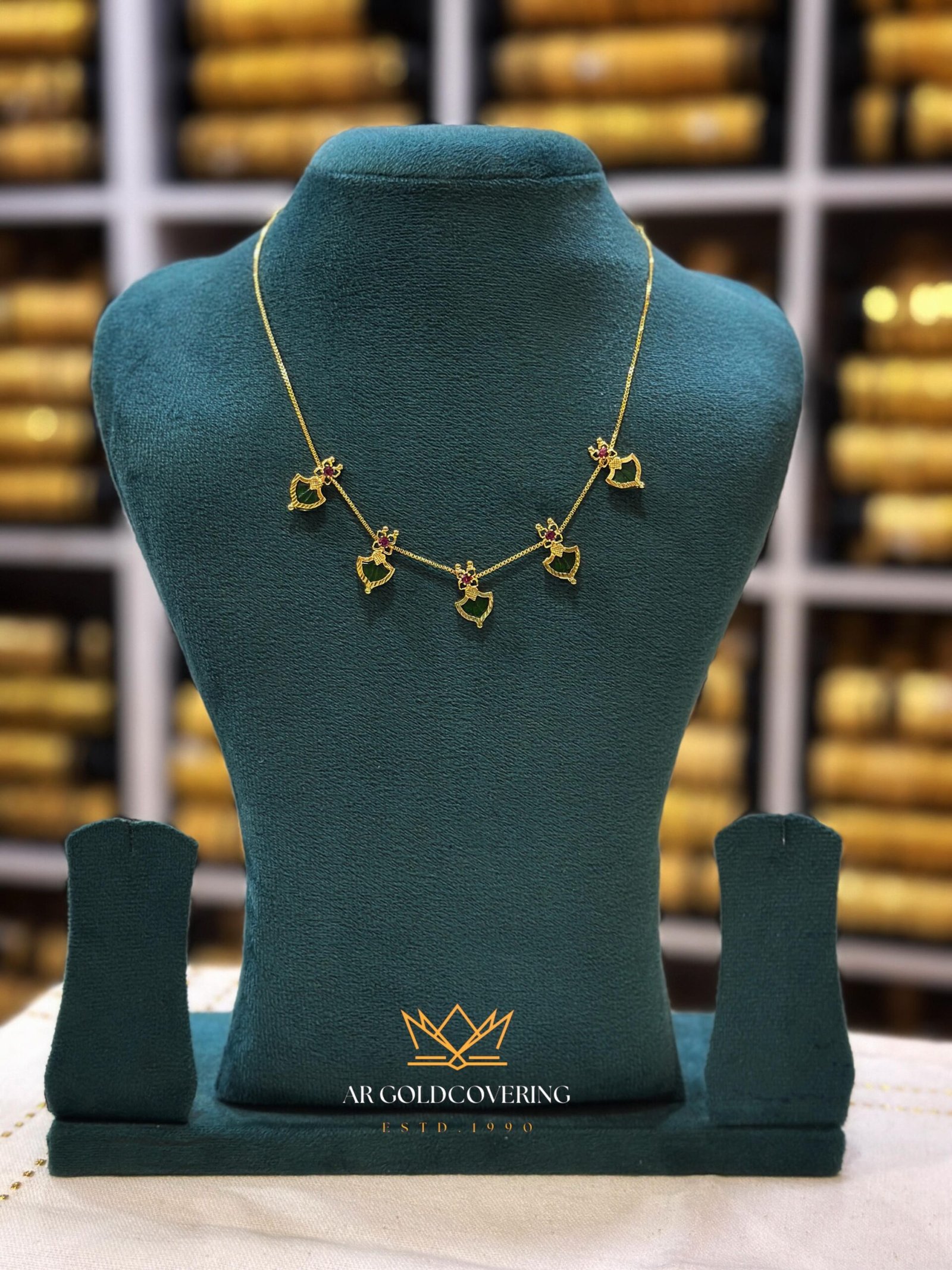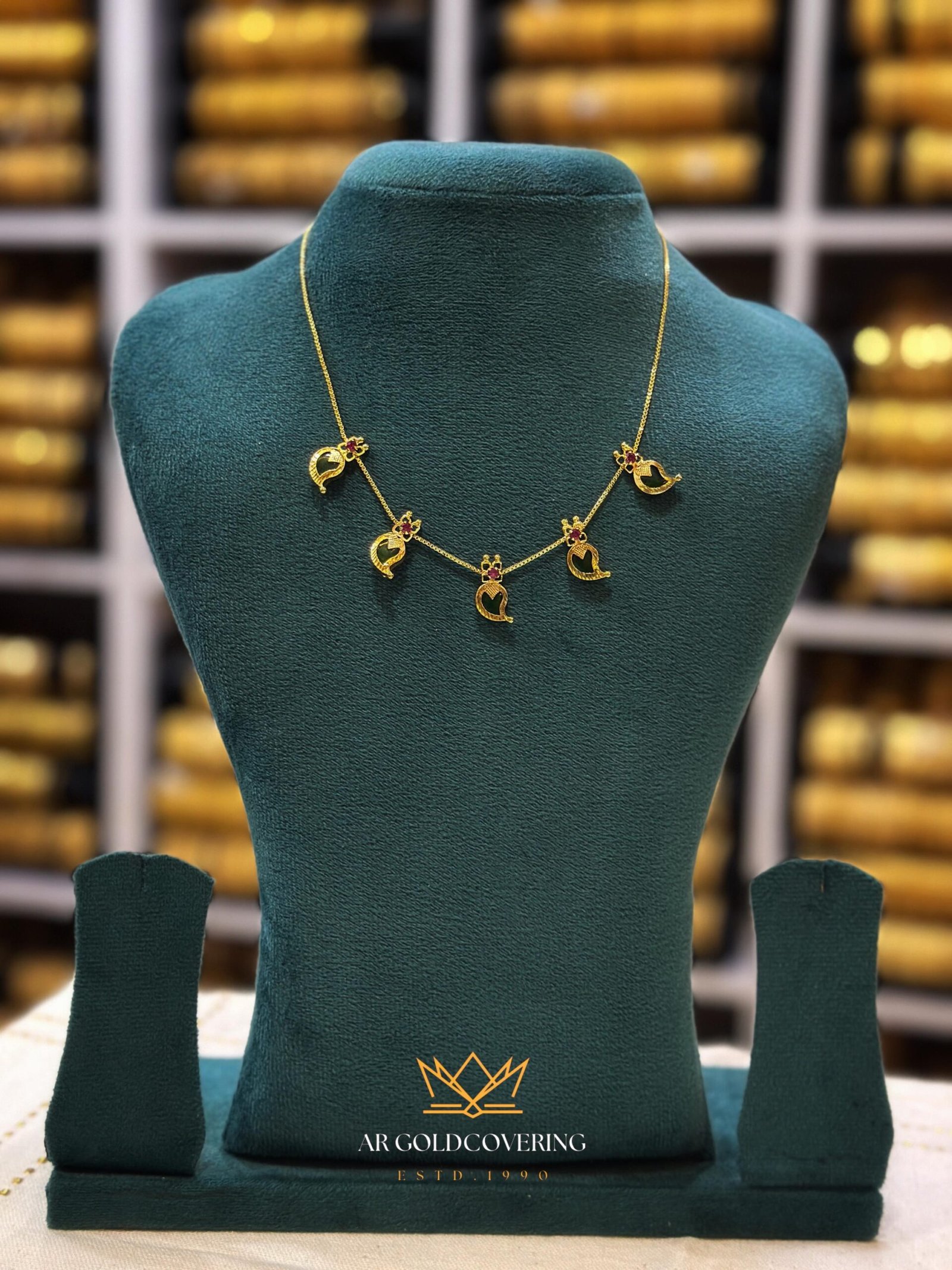 This simple necklace is available in three distinctive South Indian cultural motifs, all set with the same striking green glass stones: