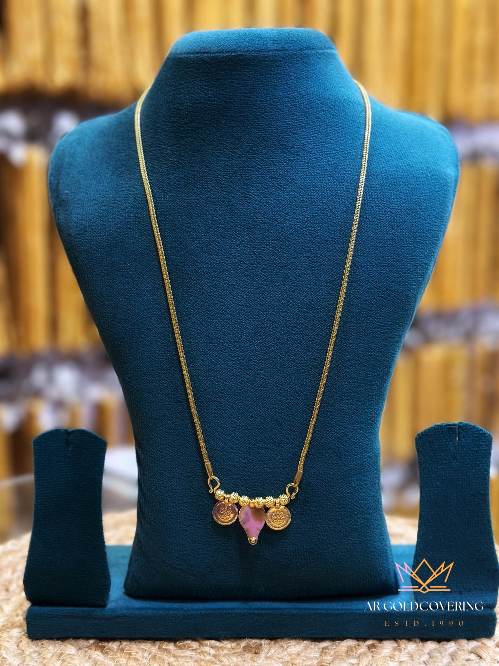 This complete set offers a beautifully designed Thali pendant paired with a durable, coordinating chain. It is an essential piece, crafted with a bright gold plated finish suitable for everyday wear.